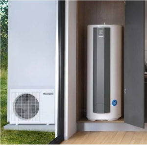 Une pompe à chaleur récupère les calories gratuites de l’air extérieur pour chauffer l’eau dans un ballon, cette eau chaude est ensuite distribuée à la salle de bain, à la cuisine, etc…